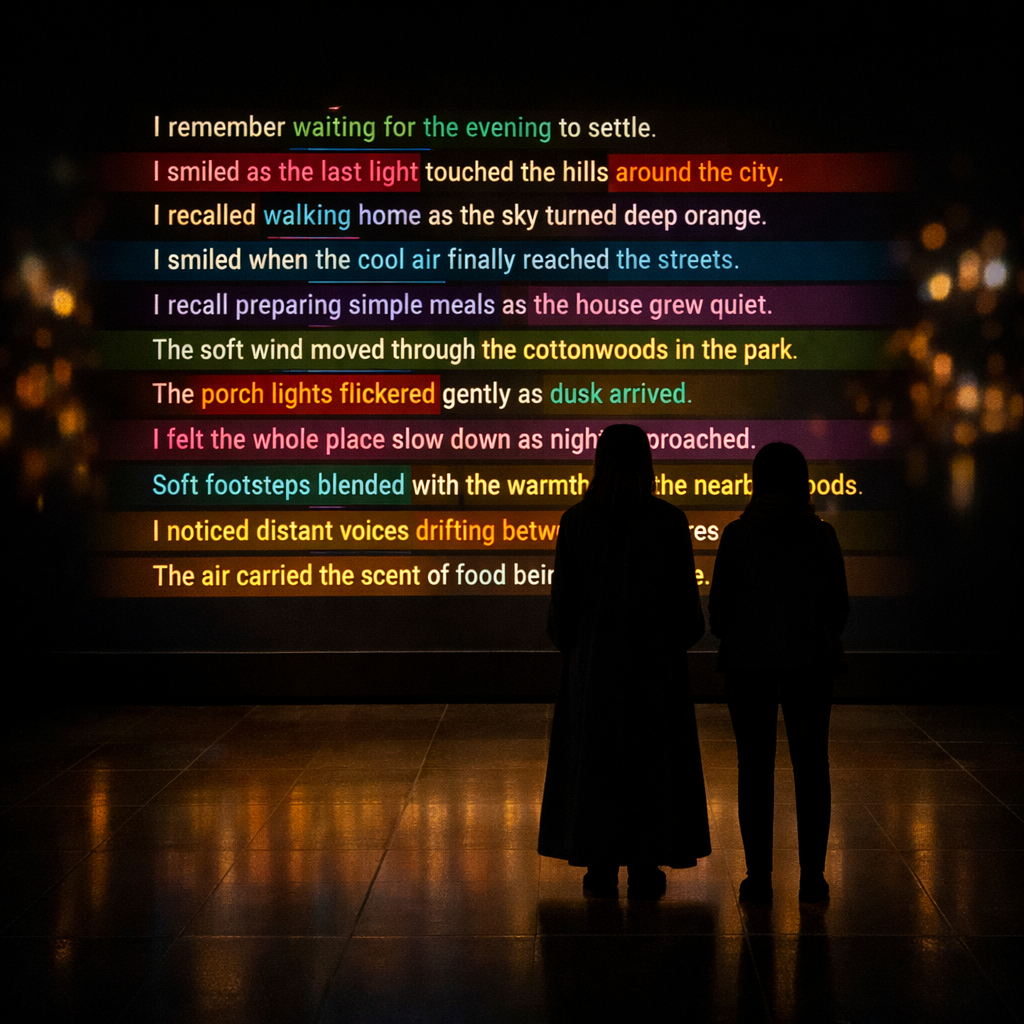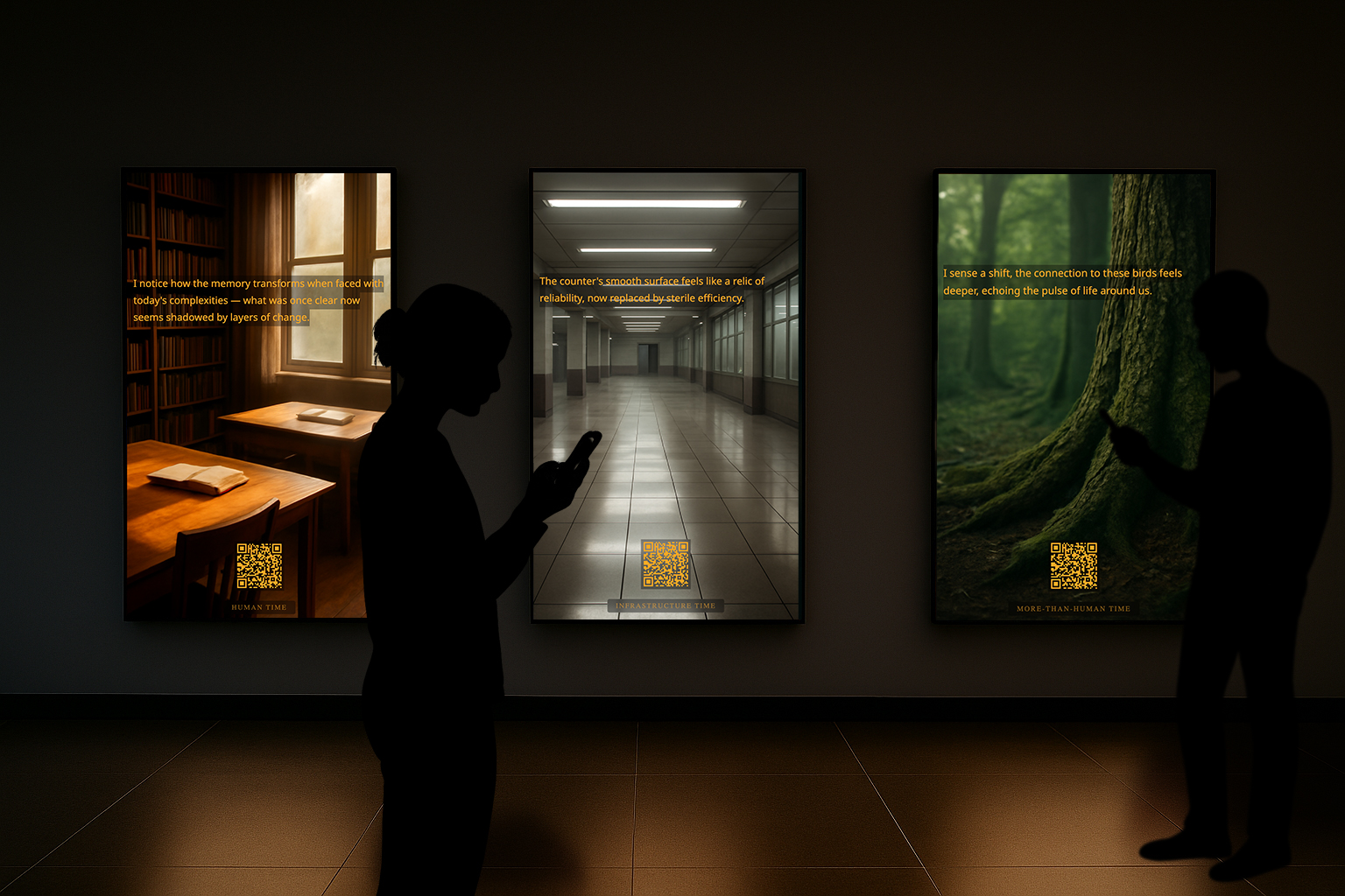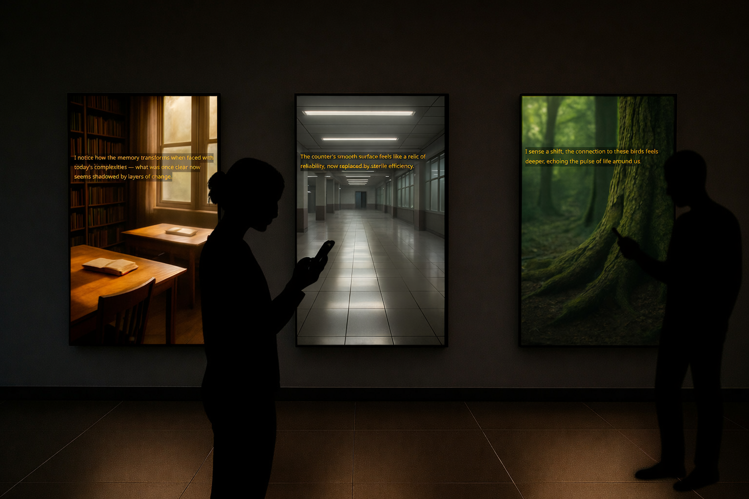Projected text, distributed screens, and a local mobile interface bring these temporal layers into contact. Through their smartphones, visitors encounter each memory in its present drifting state, with highlighted words indicating where transformation has taken place. By touching a fragment and leaving words in response, they enter the work’s ongoing process of variation, allowing memory to absorb new traces while registering degrees of resonance. As recollections move through visitor presence, environmental change, translation, and data-driven temporal rhythms, they are neither erased nor simply retained. They expand, contract, and recur in altered forms, sustaining an emotional trace even as language, image, and tone continue to shift.